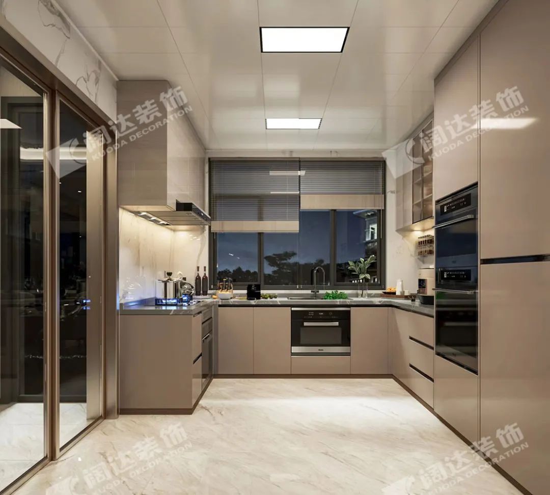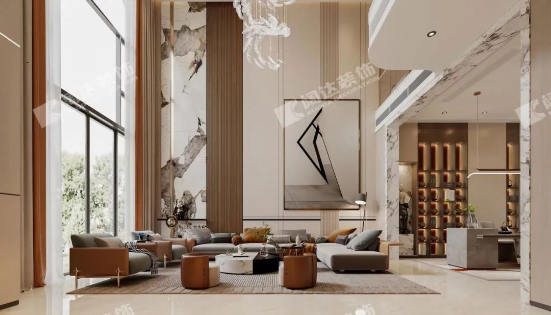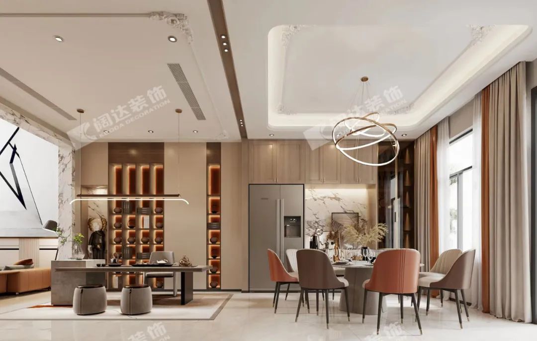 客廳:溫暖明亮,經(jīng)濟(jì)耐看是本案的主要需求之一,剔除了法式復(fù)雜的線形后,融入了現(xiàn)代溫暖明亮的暖色系風(fēng)格,材質(zhì)上搭配巖板,給予了視覺(jué)上的沖擊力,成為業(yè)主期待的理想之家。