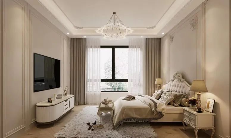 主人房:亞麻色的墻面因?yàn)槭嗑€的加入增加了不少立體度,搭配低飽和度顏色,也能打造出不一樣的視覺(jué)感受,適度加一點(diǎn)角花裝飾,提升層次感的同時(shí),盡顯優(yōu)雅。
