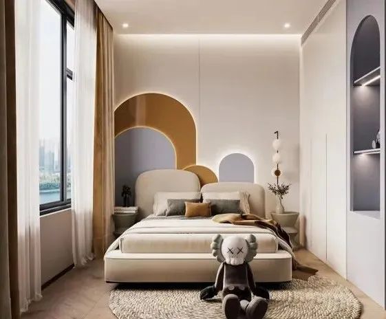 二樓:法式輕奢的主臥地面鋪木地板,定義靜謐舒適的氛圍,點(diǎn)綴金屬元素的壁燈和柜子,質(zhì)感和輕奢氣息油然而生。孩子的臥室則更加童趣。