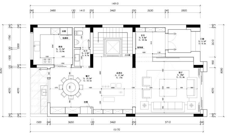 一樓:通過(guò)改造擴(kuò)大了餐廳面積,同時(shí)新設(shè)了茶區(qū)的功能。色彩和材質(zhì)的搭配讓整個(gè)空間更明亮干凈。