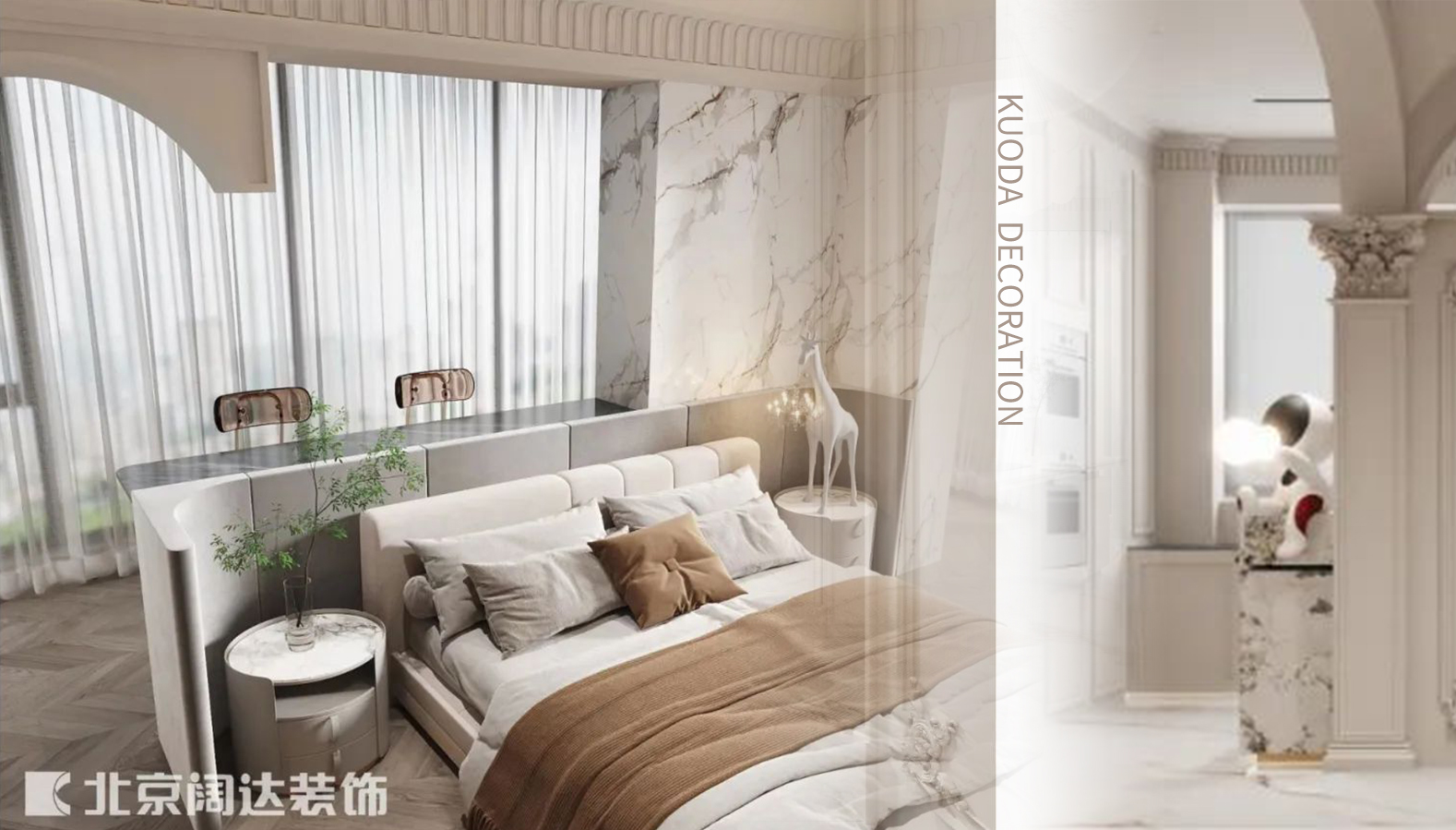 人間浪漫不過日出東方。把日出定格家中,一餐一食,皆溫柔。延續客廳的浪漫基調,復古的壁畫為餐廳融入美好氛圍感;絲絨與羊羔絨餐椅將法式的優雅完美表達。在功能上,增加島臺與餐邊柜,安裝小水槽和直飲機,縮短生活動線,提升家居舒適度。