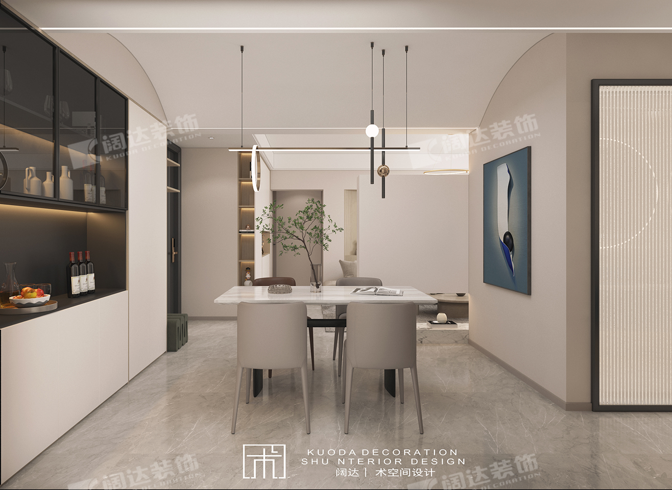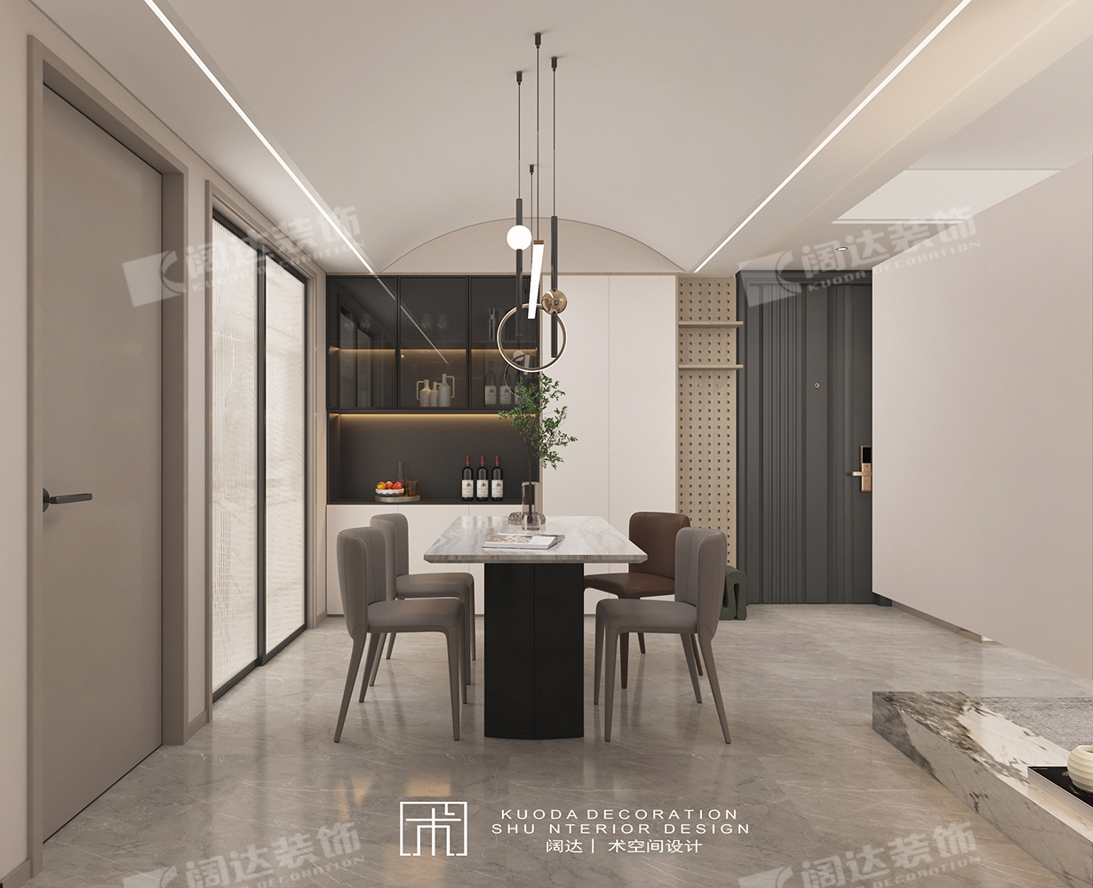 綜合以上調整結合業主需求,設計師又將陽臺墻體拆除換成移門,整體基調簡約為主,餐廳采用弧形頂設計,輔以線性燈照明,既適當放大層高,又烘托了就餐氛圍。