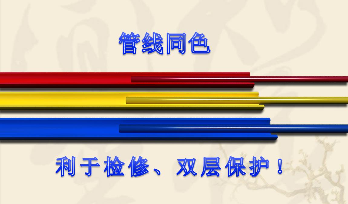 3. 線/管各分為四種顏色,對(duì)應(yīng)相應(yīng)電線,清楚區(qū)別火線、零線、地線、回路線,非專業(yè)人員也能識(shí)別并維修更換,實(shí)實(shí)在在保證施工與維修中不會(huì)發(fā)生接錯(cuò)的現(xiàn)象,保證用電安全。